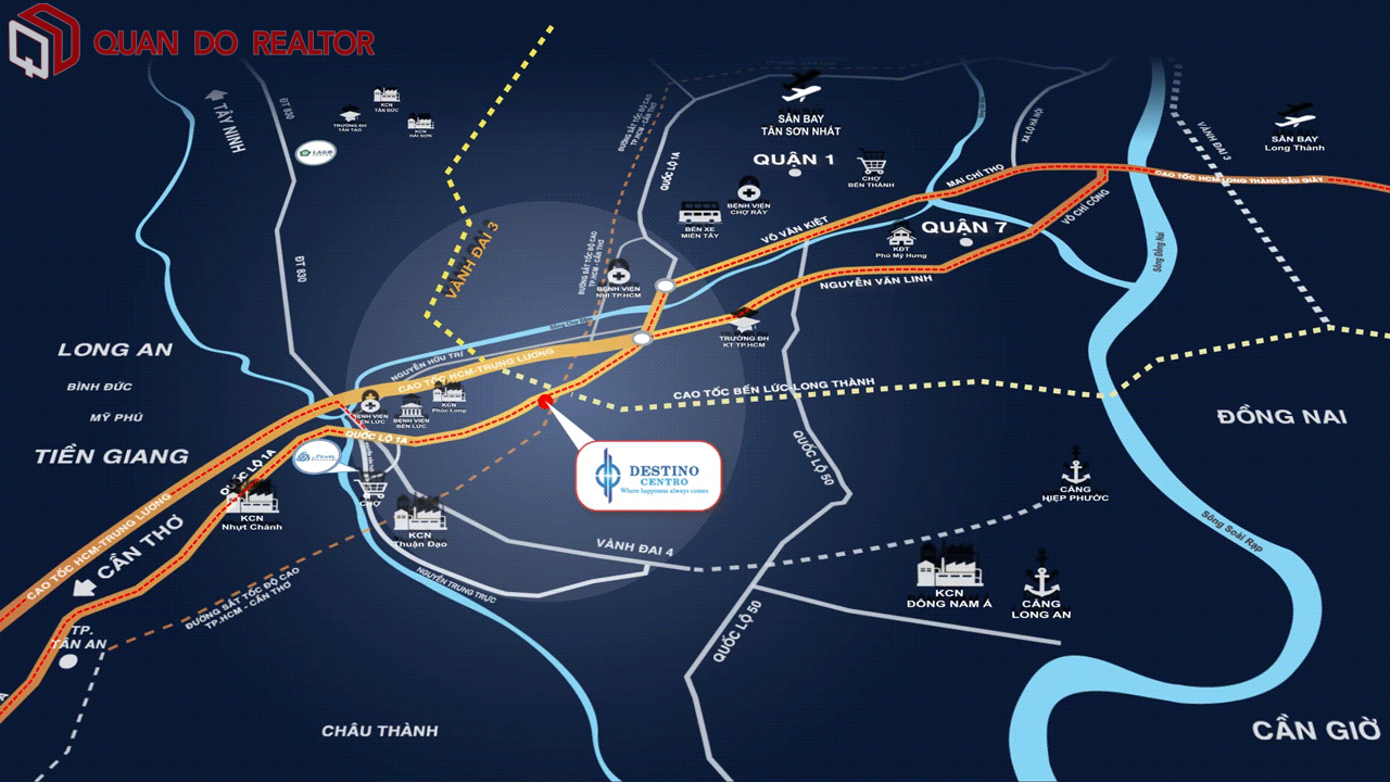 Vị trí của Destino Centro là một trong những yếu tố quan trọng làm nên giá trị của dự án. Nằm tại Bến Lức, Long An, dự án hưởng lợi từ vị trí chiến lược với nhiều kết nối giao thông thuận lợi: